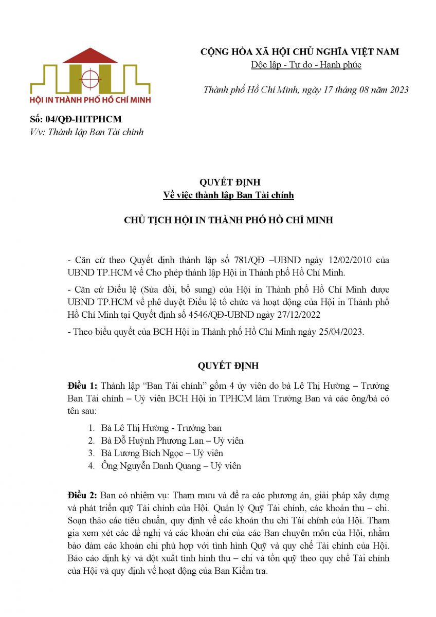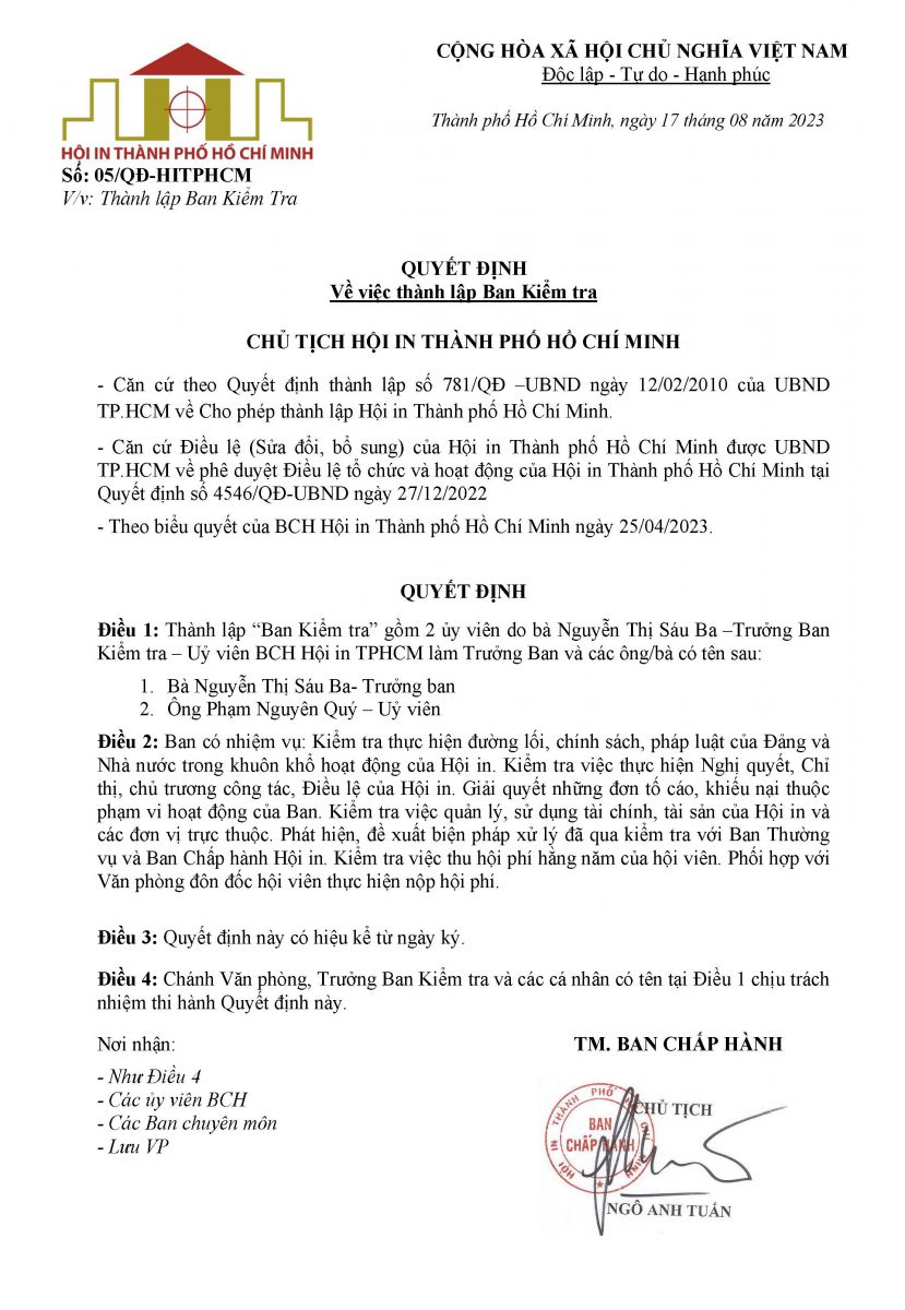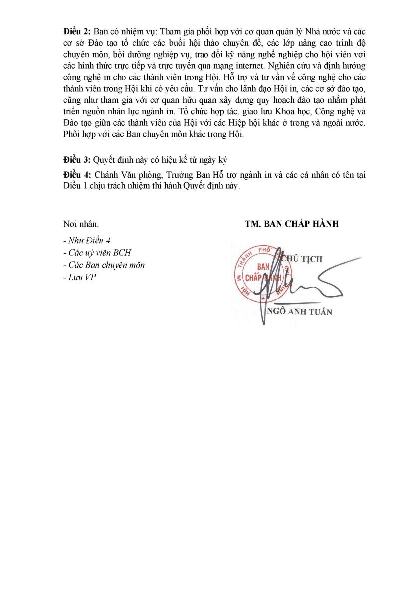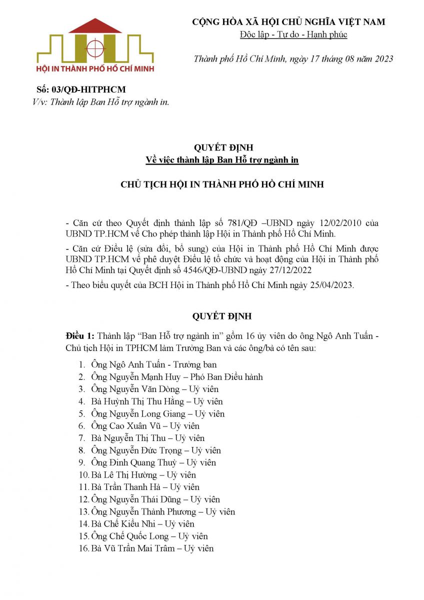| 1 | Ông Ngô Anh Tuấn | Chủ tịch Hội In Thành phố Hồ Chí Minh |
